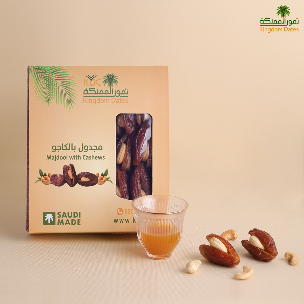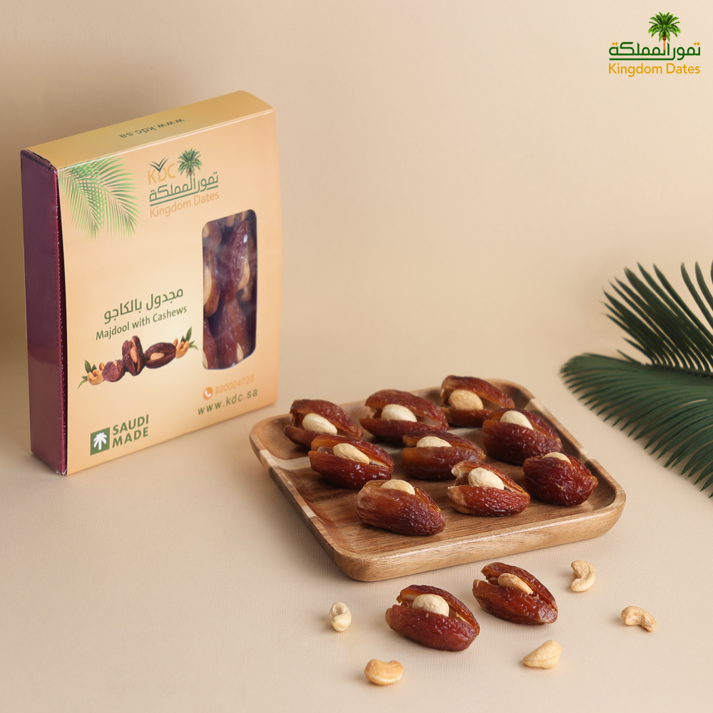 تمر المجدول بحشوة الكاجو هو خيار ممتاز لمن يبحثون عن وجبة خفيفة صحية ولذيذة. حيث إنه يجمع بين فوائد التمر والكاجو، ويقدم طعمًا فريدًا وقيمة غذائية عالية ويتم اختيار تمر المجدول بعناية، ثم يتم حشوها بالكاجو اللذيذ المقرمش. ويعتبر هذا المنتج خيارًا شهيًا وصحيًا كوجبة خفيفة.